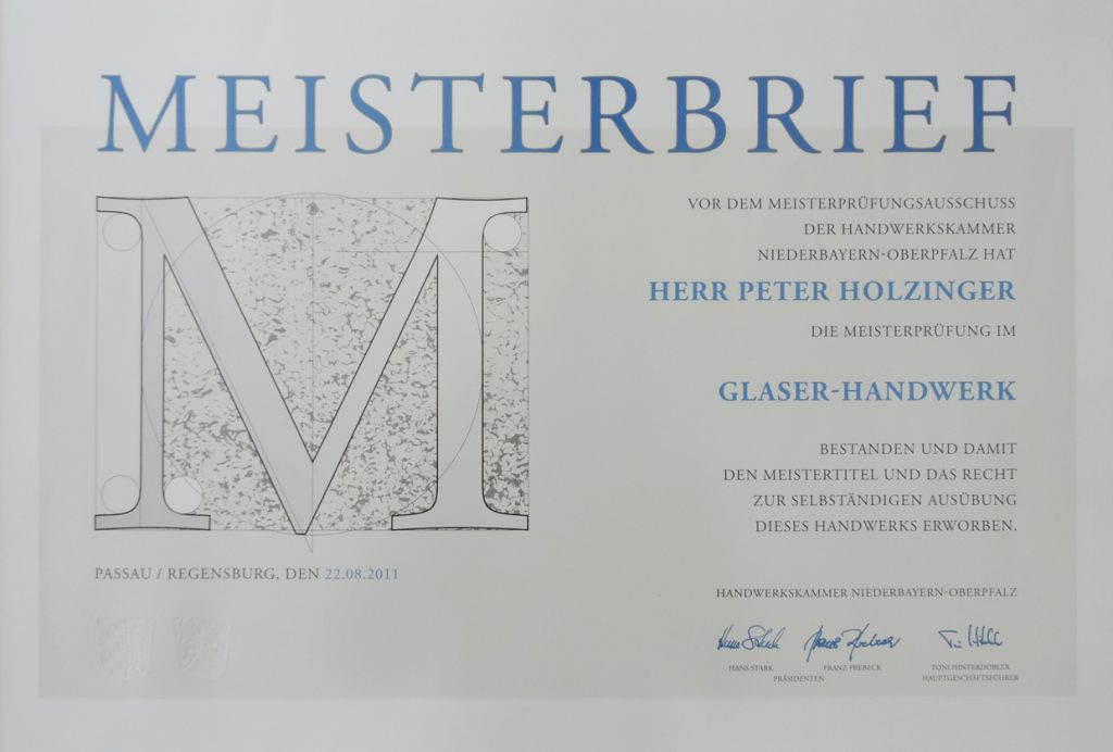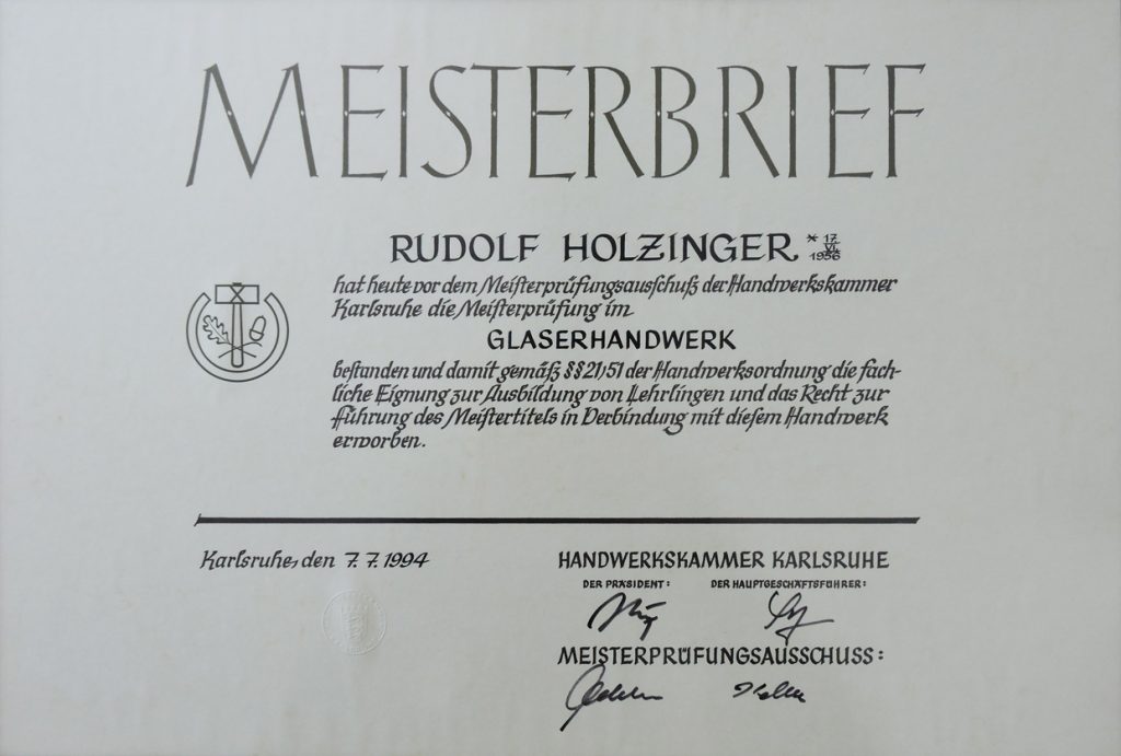 Die Glaserei Holzinger wurde 2003 von Glasermeister Rudolf Holzinger gegründet. Er hat die Meisterschule in Karlsruhe besucht und 1994 den Meistertitel erworben.